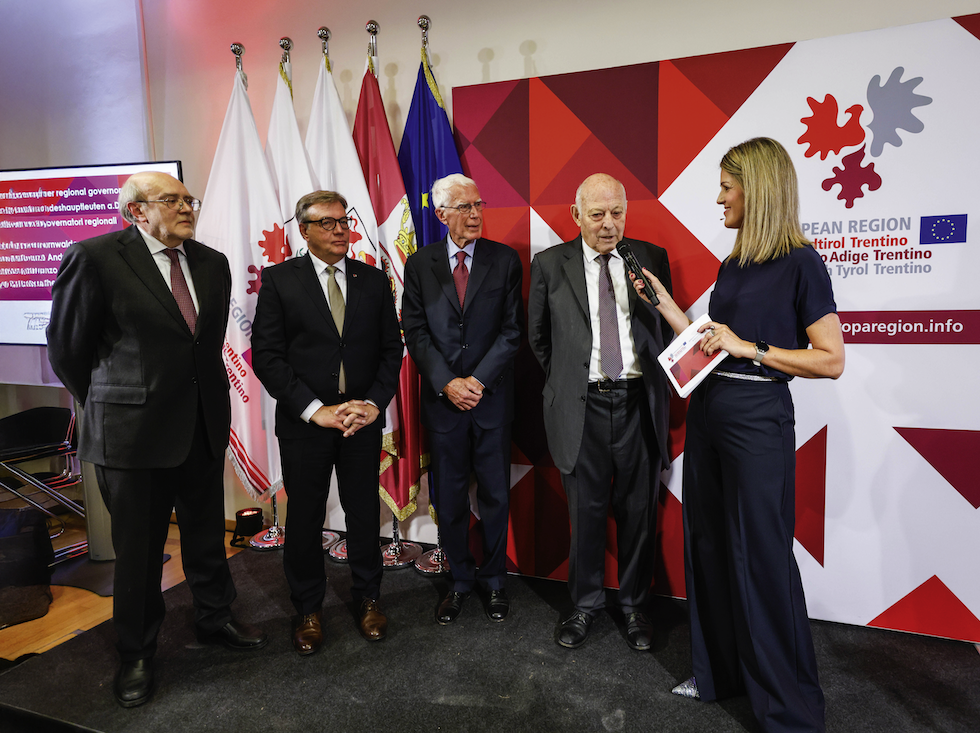 - Nel corso della cerimonia celebrativa, gli ex presidenti della Provincia (da sinistra) Lorenzo Dellai, Günther Platter, Carlo Andreotti e Luis Durnwalder hanno raccontato la fondazione della Rappresentanza dell’Euregio. Claudia Messner, direttrice dell’Agenzia di stampa e comunicazione della Provincia di Bolzano, ha moderato la cerimonia. (Foto: Euregio/Elio Germani) » [IMG 1 MB]